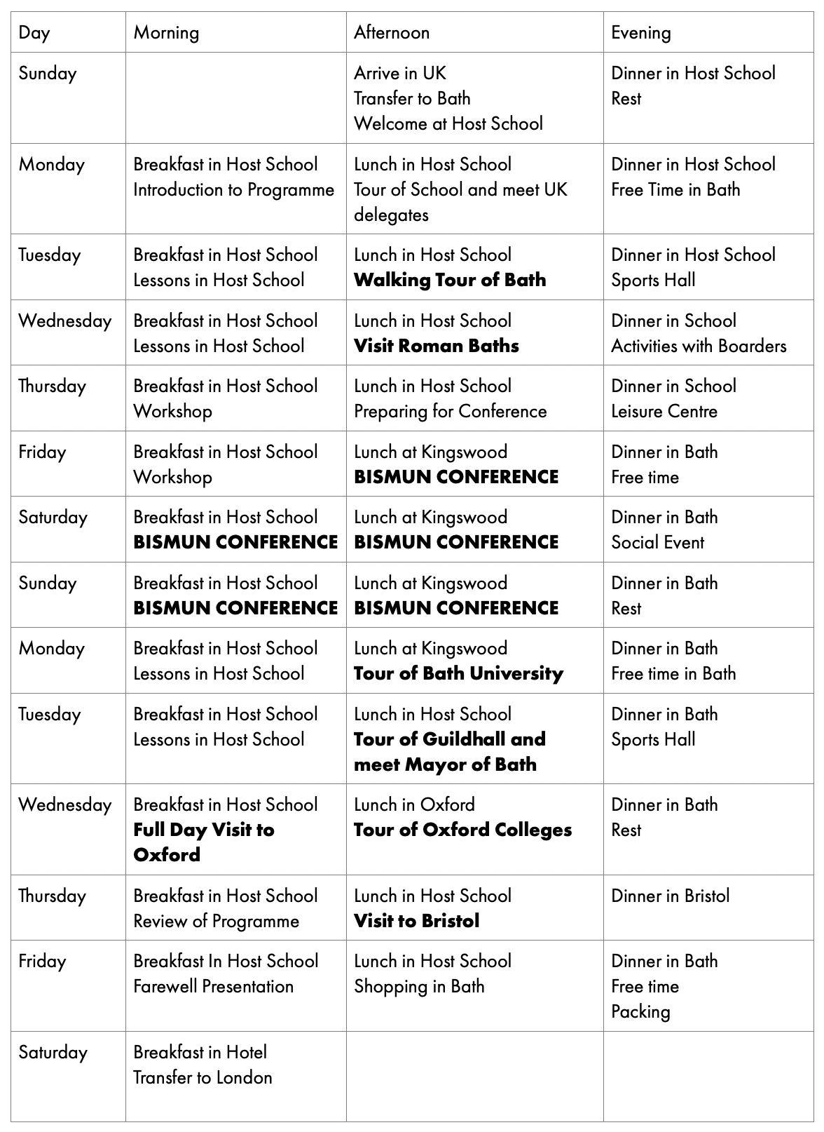 The BISMUN conference will run from Friday to Sunday, after which participants will travel to Oxford and Bristol for guided visits, offering further insight into the academic and cultural heritage of these iconic British cities. This programme offers a well-rounded blend of academic challenge, cultural immersion, and international engagement.